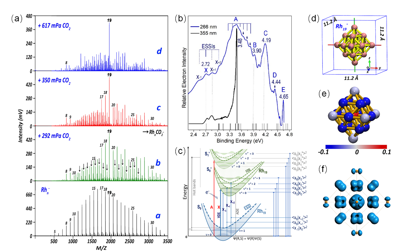图2 (a)基于自主研制仪器(TOF-MS)制备的阴离子Rhn-团簇与CO2反应前后的质谱图;(b)Rh19-团簇分别在355 nm和266 nm激光下的光电子能谱;(c)金属团簇电子自旋态异构体(Electron-spin state isomers, ESSIs)机制;(d)由全局搜索确定的Rh19-的最低能量结构及范德华半径;(e)Hirshfeld电荷布居;(f)Rh19-的自旋密度布居。