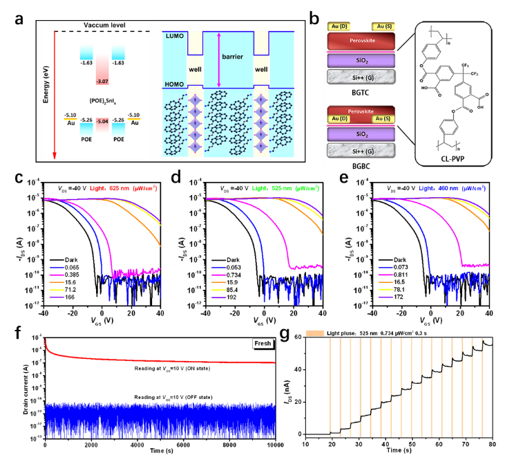 图.(a)能级结构图;(b)两种器件结构和界面修饰层CL-PVP分子式;(POE)2SnI4晶体管在暗态和(c)红、(d)绿、(e) 蓝光下的转移曲线;(f)存储器件在写入和擦除后的持续性性能;(g)光脉冲信号下的多级存储。