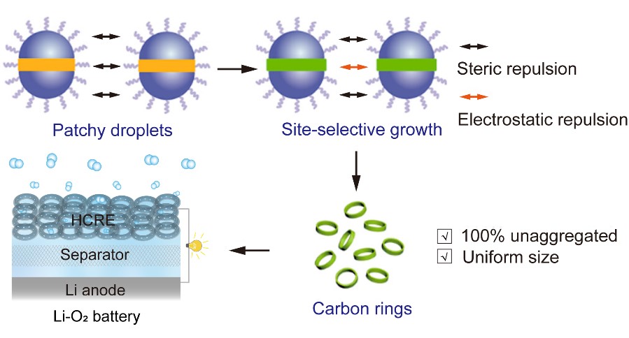 最近,该课题组为发展环基胶体材料,将“patchy模版合成”策略推广到液滴模版,利用液滴特殊的保护作用与稳定能力,发展了一种选择性生长新方法,实现了多种材料特别是碳环100%无粘连聚集的高效合成,并将胶体碳环用于构建锂氧电池的自支撑电极。研究表明,该工作合成的碳环显示了较强的过氧化锂沉积活性。特别是,构建的碳环电极所具有的大孔通道极大促进了锂氧电池中的离子传输和气体扩散,提升了电池的电化学性能,首圈放电比容量高达20658 mAh/g。进一步,他们通过直接观察放电过程中过氧化锂在碳环上的成核、生长及其随锂盐浓度的动态演化过程,理解了碳环电极体系高放电比容量的微观机理。该工作为构建多层次多孔电极在电催化和电化学储能中的应用提供了新途径。相关研究成果近日发表于Journal of the American Chemical Society期刊上(2023, DOI: 10.1021/jacs.3c09716),文章第一作者为博士生时尚,共同第一作者为博士后沈珍珍,通讯作者为文锐研究员和刘冰研究员。