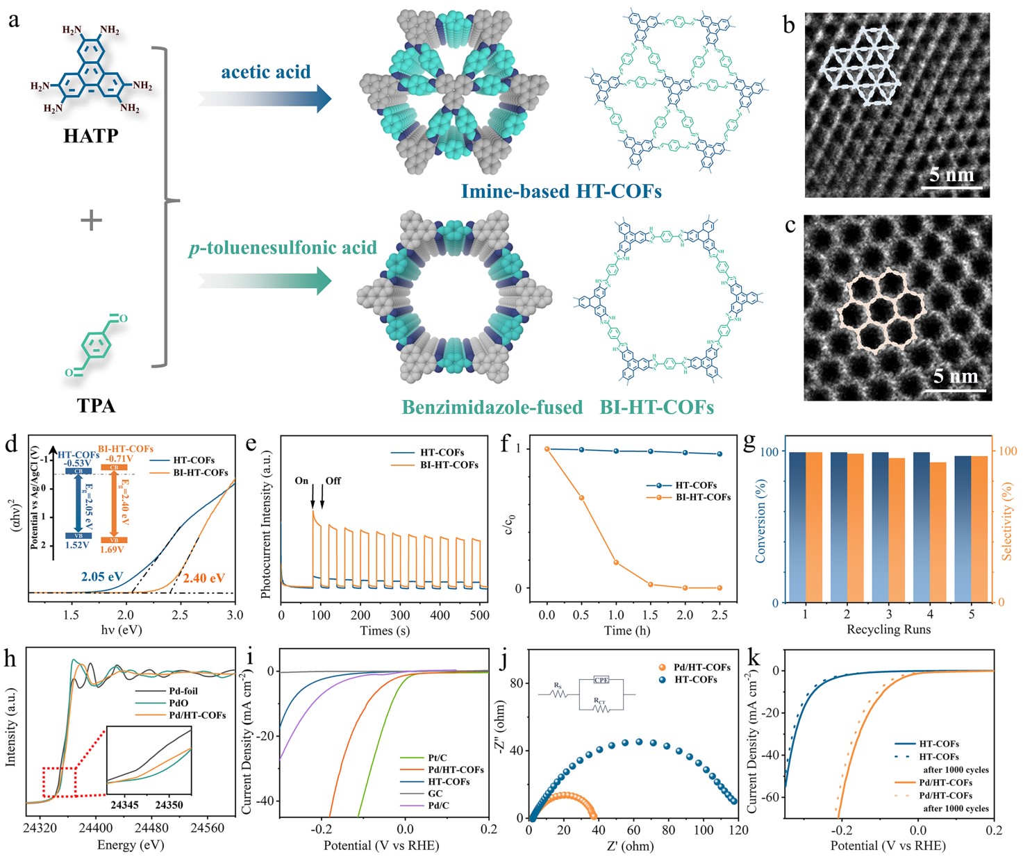 图1 (a)HT-COFs和BI-HT-COFs合成过程示意图。(b)HT-COFs的TEM图像。(c)BI-HT-COFs的TEM图像。(d)HT-COFs和BI-HT-COFs的Tauc plots图。(e)HT-COFs和BI-HT-COFs的光电开关测试。(f)HT-COFs和BI-HT-COFs氧化苯甲硫醚的反应过程曲线。(g)BI-HT-COFs光催化剂的稳定性。(h)Pd K-edge的XANES光谱。(i)Pt/C, Pd/C, HT-COFs, and Pd/HT-COFs的LSV curves。(j)HT-COFs和Pd/HT-COFs的Nyquist plots。(k)1000次CV循环前后HT-COFs和Pd/HT-COFs的LSV curves。
