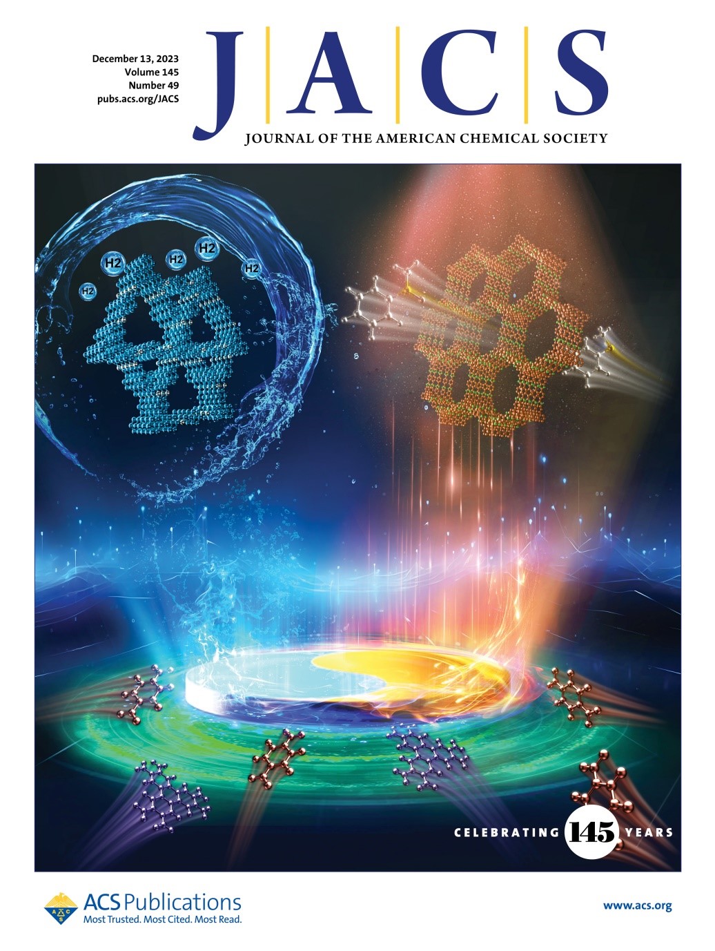 图2 Front cover。通过简单地改变酸催化剂,实现了两种不同的2D COFs的拓扑选择性合成,即亚胺连接的HT-COFs和苯并咪唑连接的BI-HT-COFs。BI-HT-COFs在光催化苯甲硫醚的氧化反应过程中表现出优异的催化活性。HT-COFs为Pd创造了良好的配位环境,所得的Pd/HT-COFs具有良好的电化学析氢反应催化性能。