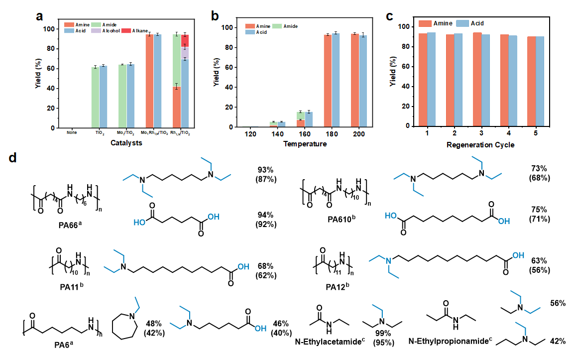 近期,该课题组提出了一条酸解与加氢耦合实现尼龙解聚转化制备羧酸和叔胺的新策略。他们设计合成了Mo单原子与Rh纳米颗粒协同作用的催化剂Mo1Rh1,N/TiO2,在温和条件下(例如180 °C),该催化剂可催化尼龙的乙酸解聚,生成相应的羧酸和二酰胺中间体,并进一步催化二酰胺加氢生成叔胺,以100%的选择性将各种尼龙转化为相应的羧酸和叔胺产物。研究表明,Mo单原子与Rh颗粒通过金属-金属相互作用,产生有效的Mo/Rh活性中心,通过强配位能力选择性活化二乙酰胺中间体;同时,Rh颗粒活化H2,形成氢溢流环境,为Mo和Rh原子上吸附的酰胺键提供活性H,实现二酰胺加氢生成叔胺产物,从而有效抑制羧酸加氢。