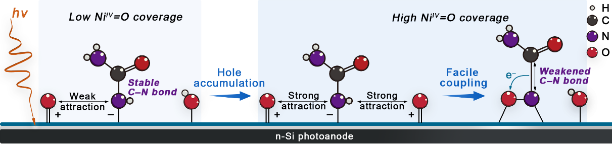 最近,他们发现在氧化镍修饰的N型硅光阳极表面,捕获态空穴与吸附态尿素之间存在强吸引作用,其可诱发近乎无能垒的氮–氧偶联过程,继而削弱尿素分子中碳–氮键的成键能力并提升尿素分解动力学。定量结果显示,当表面空穴(高价镍–氧物种)覆盖度由0提升至1时,尿素分解活化能从0.74 eV降低至0.41 eV,对应的尿素分解速率提升超两个数量级。进一步地,通过增加辐照强度促进表面空穴累积,在1.08 VRHE的低偏压下实现了100 mA cm−2的工业级光电流密度。这一工作为提升光电催化尿素氧化活性提供了新策略。