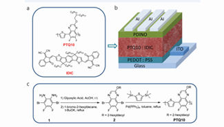 聚合物太阳电池由p-型共轭聚合物给体和富勒烯衍生物或非富勒烯n-型有机半导体受体的共混活性层夹在透明导电电极和金属电极之间所组成,具有可溶液加工、质量轻、以...