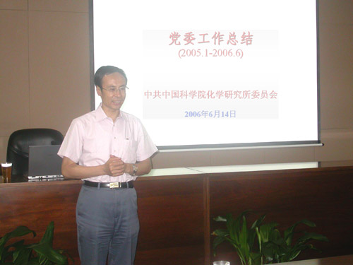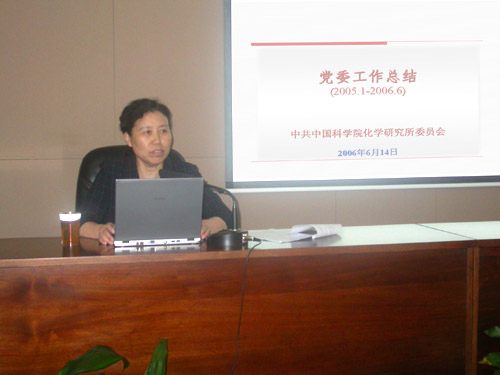 杨淑霞书记代表化学所党委作了2005.1-2006.6期间党委工作总结报告。报告共分十一个部分,一是深入开展保持共产党员先进性教育活动;二是充分发挥政治核心和监督保证作用,促进研究所各项工作的开展;三是加强领导班子建设,促进和谐发展;四是加强基层党组织建设,探索建立保持共产党员先进性的长效机制;五是加强党风廉政建设,做好反腐工作;六是统战工作;七是搭建平台,有效发挥群众组织作用;八是充分认识新形势下做好离退休工作的重要性;九是加强研究生思想政治教育,培养德才兼备的优秀人才;十是化学所2005年至2006年的获奖情况;十一是今后的努力方向。