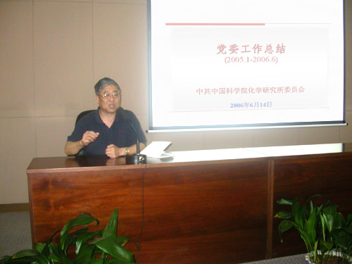 工作报告结束后,与会人员对党委的工作进行评议。新材料实验室主任宋延林研究员、纳米科技党支部书记方晓红研究员、院士党员朱起鹤研究员、民主党派人士李永舫研究员、学生党员夏帆等先后发言,大家充分肯定了化学所党委一年半的工作和取得的成绩,对党委今后的工作提出了许多建议。朱起鹤院士还特别强调了加强学生思想政治工作的重要性,希望党委通过各种有效途径和形式,营造有利于加强思想政治工作和学术道德建设的良好氛围。