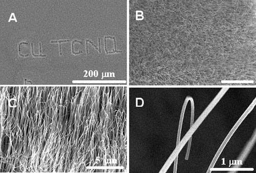 在中国科学院、国家自然科学基金委、国家科技部的支持下,化学所有机固体院重点实验室在此前CuTCNQ单晶纳米材料控制合成(J. Am. Chem. Soc.2005, 127, 1120-1121; Adv. Mater. 2005, 17, 2953-2957)的基础上,结合物理气相传输生长高质量有机单晶的经验(Adv. Mater. 2006, 18, 65-68),以物理气相传输和原位化学反应相结合的方法,大面积生长了CuTCNQ的单晶纳米带。并以此为契机,与微电子所刘明研究员等合作,发展了一种构筑有机纳米器件和纳米器件阵列的方法。器件的测试结果证明:隶属于相I的这种CuTCNQ单晶纳米带表现出半导体的特性,这为CuTCNQ开关和存储机理的进一步研究打下了基础。有关研究结果发表在近期《美国化学会志》(J. Am. Chem. Soc. (2006, 128, 12917-12922)上。