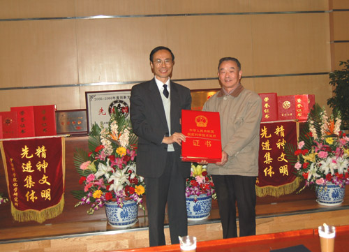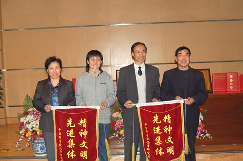 下午的大会首先进行颁奖,姚建年副所长宣读2006年度化学所集体和个人获得的各项荣誉。万立骏所长向获得国家自然科学二等奖项目的代表王殿勋研究员颁发了获奖证书。万立骏所长、杨淑霞书记向荣获2006年度化学所精神文明先进单位的分析化学党支部、机关党支部颁发了流动红旗。