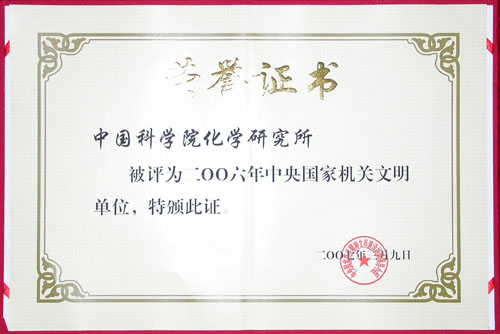 根据国机精[2007]1号文件关于表彰2006年度中央国家机关文明单位的决定,化学所被中央国家机关精神文明建设协调领导小组等七部门联合评为中央国家机关2006年文明单位。这是继2003年、2004年、2005年连续三年被评为中央国家机关文明单位之后,化学所第四次获此殊荣。