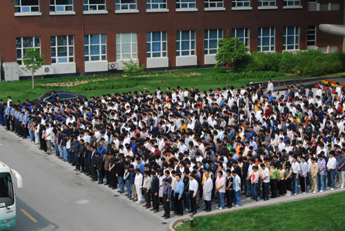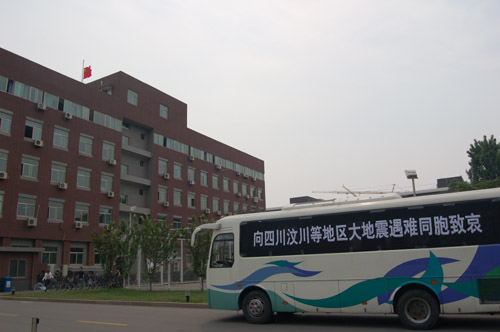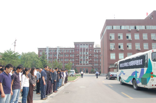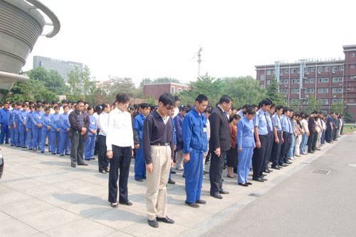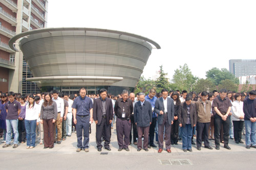5 月19日 ,化学所降半旗为四川汶川等地大地震遇难同胞志哀。19日14时28分,万立骏所长主持默哀仪式,化学所全体职工和学生们在分子楼广场前集合,为在汶川大地震中遇难的同胞集体默哀三分钟,汽车喇叭也同时鸣响,以表达我们共同的心愿:请逝者安息。我们将永远与灾区同胞们携手同心,众志成城,共渡难关。