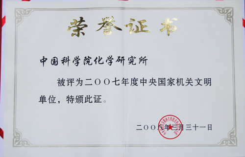 根据国机精[2008]1号文件《关于表彰2007年度中央国家机关文明单位的决定》,化学所被中央国家机关精神文明建设协调领导小组等七部门联合评为中央国家机关2007年文明单位。这是继2003年、2004年、2005、2006年连续四年被评为中央国家机关文明单位之后,化学所第五次获此殊荣。