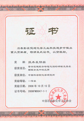 中科院化学所与江苏索普(集团)有限公司合作的“螯合型铑配合物催化剂的研制及其在醋酸合成中的应用”项目,获得2008年中国石油和化学工业协会技术发明一等奖。