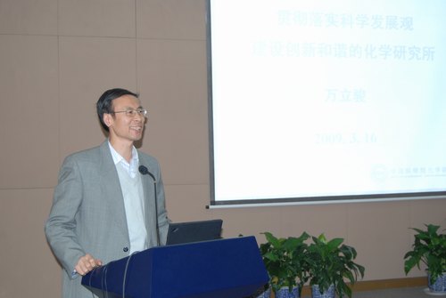 万立骏所长代表化学所作了题为“贯彻落实科学发展观,建设创新和谐的化学研究所”的报告,从化学所的定位与发展目标、研究领域、人才队伍、研究工作进展、技术支撑体系建设等方面,向路院长一行汇报了化学所的近期工作,重点汇报了化学所高技术研究领域的部分项目进展情况。