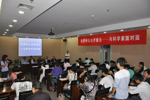 在分子楼101会议室进行的与科学家面对面互动交流活动,由王笃金副所长主持。黄志镗院士、王东研究员、王身国研究员、胡友良研究员、范青华研究员和社会公众面对面交流互动,现场解答了大家提出的很多问题,如“白色污染”怎样解决、如何用化学方法进行海水淡化,高分子材料中的增塑剂问题怎么解决等,这些日常生活中发生的有趣的现象、难解的疑团在这里都从化学的角度得到了答案。零距离的接触,使平日让大家景仰的院士、科学家们,成为了和蔼可亲可敬的师长和朋友。现场的互动也使公众感受了科学的魅力。