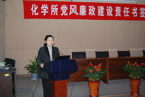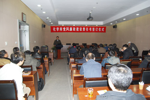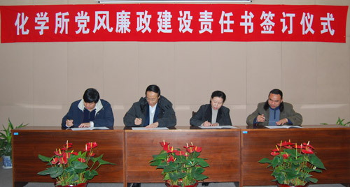 为深入贯彻落实党的十七大精神和中共中央、国务院关于实行党风廉政建设责任制的规定,进一步推进研究所党风廉政建设,根据中科院党组和京区党委的要求和部署,11月25日上午,化学所举行党风廉政建设责任书签订仪式。化学所全体所领导、所长助理、处长、室主任、党支部书记参加了签订仪式。签订仪式由党委副书记、副所长杨振忠主持。