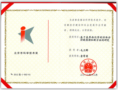 化学所毛兰群研究员、于萍副研究员等完成的项目“基于表界面化学的活体分析新原理和新方法的研究”获得2012年度北京市科学技术奖一等奖。