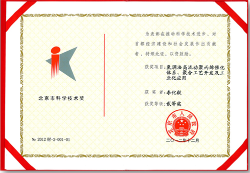 化学所李化毅副研究员、王笃金研究员等与中国石油化工股份有限公司北京燕山分公司共同完成的项目“氢调法高流动聚丙烯催化体系、聚合工艺开发及工业化应用”获得2012年度北京市科学技术奖二等奖。