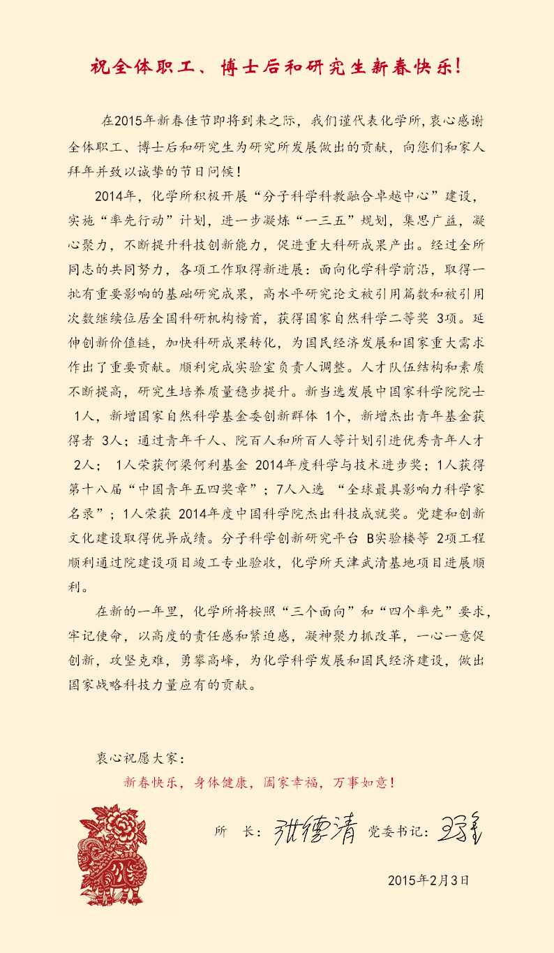 亚博888是以基础研究为主,有重点地开展国家急需的、有重大战略目标的高新技术创新研究,并与高新技术应用和转化工作相协调发展的多学科、综合性研究所。60多年以来,几代化学所人不懈努力,顽强拼搏,勇攀高峰,形成了创新、求是、团结、奉献的优秀文化,为我国科技事业、国民经济和国家重大需求做出了重要贡献。中国科学院知识创新工程以来,化学所以建设国际一流的化学研究机构为目标,不断凝练科技目标,调整和完善了科研组织结构;坚持“引进与培养并重”,形成了一支结构合理、素质精良的科技创新队伍;瞄准科学前沿,注重原始创新和学科交叉,取得了一批有重要影响的基础研究成果
