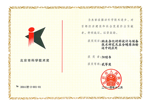 阳明书研究员等完成的项目“纳米杂化材料设计与制备技术研究及在含蜡原油输运中的应用”获得2014年度北京市科学技术奖二等奖。