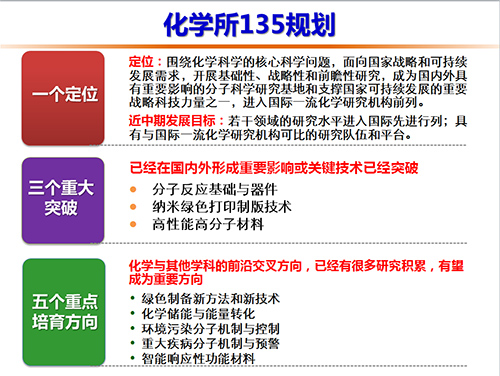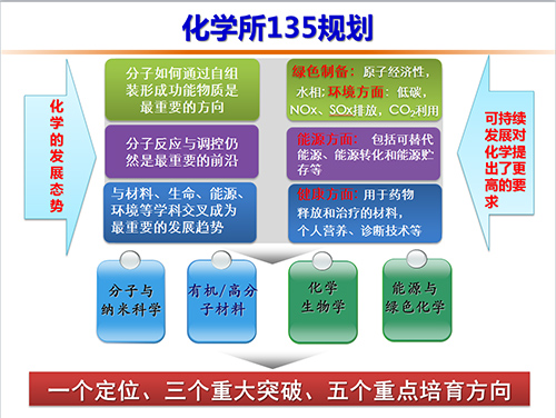 按照中科院的总体部署,根据化学的发展态势和可持续发展对化学提出的更高要求,结合化学所的实际,化学所认真凝练出研究所“一三五”规划。几年来,化学所以中科院新时期办院方针为指导,求真务实,凝心聚力,坚持面向化学科学前沿、面向国家重大战略需求、面向国民经济主战场,扎实推进“一三五”规划实施,在三个重大突破、五个培育方向方面取得系列突破性成果,使化学所成为国内外具有重要影响的分子科学研究基地和支撑国家可持续发展的重要战略科技力量之一。