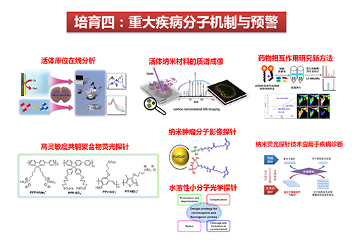 设计合成了包括基因、蛋白、活性氧等光学探针;利用共轭聚合物构建了新型光学探针,有望成为结肠癌诊断的新方法;以磁性氧化铁、稀土纳米颗粒及量子点为核心,构建了肿瘤特异性成像探针;开发了检测人体静脉血诊断白血病的新技术。