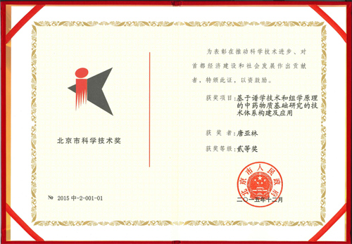 唐亚林研究员等完成的项目“基于谱学技术和组学原理的中药物质基础研究的技术体系构建及应用”获得2015年度北京市科学技术奖二等奖。