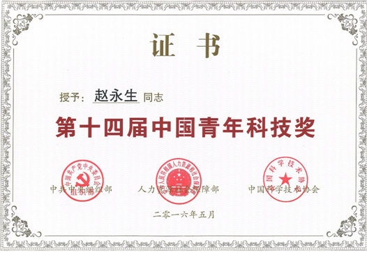 根据《中共中央组织部人力资源社会保障部中国科学技术协会关于表彰第十四届中国青年科技奖获奖者的决定》(组通字〔2016〕30号),化学所赵永生研究员荣获第十四届“中国青年科技奖”。