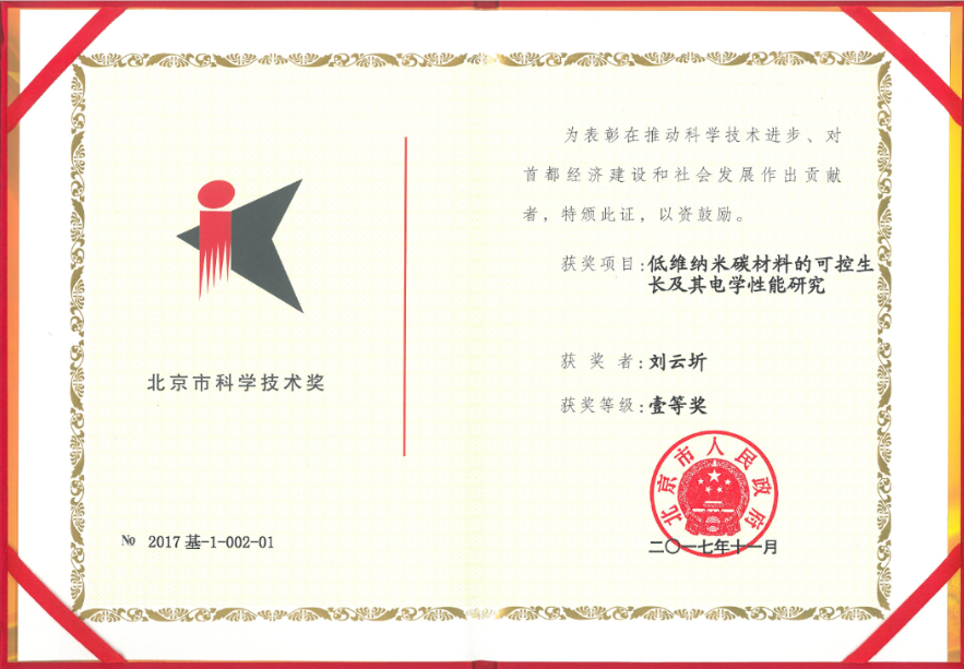 刘云圻研究员等完成的项目“低维纳米碳材料的可控生长及其电学性能研究”获得2017年度北京市科学技术奖一等奖。