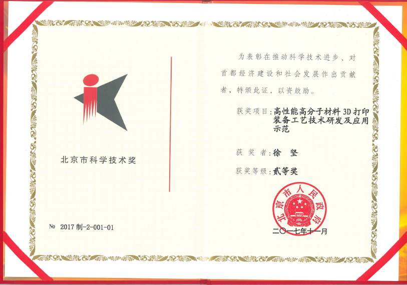 徐坚研究员等完成的项目“高性能高分子材料3D打印装备工艺技术研发及应用示范”获得2017年度北京市科学技术奖二等奖。