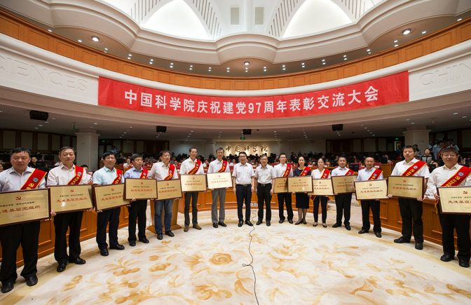 2018年6月29日,为热烈庆祝建党97周年,回顾党的光辉历史,深入学习习近平新时代中国特色社会主义思想和党的十九大精神,表彰一批党的十八大以来伴随我院重大创新成果产出涌现出的先进基层党组织和优秀共产党员,中国科学院召开庆祝建党97周年表彰交流大会。全院共有14个党支部、30名党员荣获中国科学院“新时代科技报国”先进基层党组织、优秀共产党员表彰。