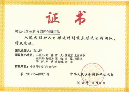 根据《科技部关于公布2017年创新人才推进计划入选名单的通知》(国科发政〔2018〕186号),化学所毛兰群研究员作为负责人的“神经化学分析与调控创新团队”入选重点领域创新团队。