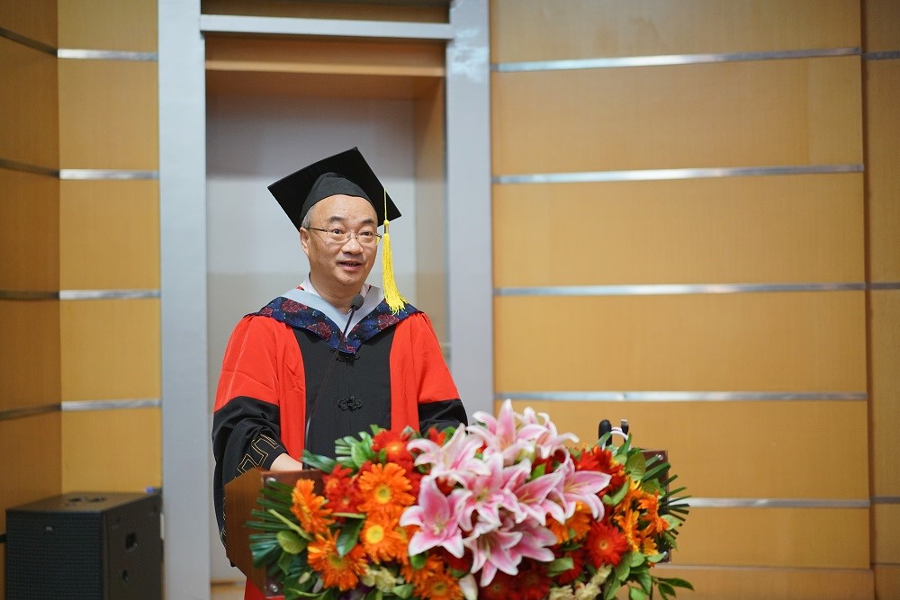 侯剑辉研究员代表全体导师致辞。他首先祝贺毕业生们顺利毕业,希望全体毕业生今后继续保持对学习的热情和对科学的追求。之后,他在对付出了辛勤工作的毕业生表示感谢的同时送上嘱托,毕业生将面临角色的转变,他希望毕业生们在做选择的时候可以好好坐下,冷静的分析,在想清楚之后再努力前行。最后,他勉励每位毕业生要不忘初心,砥砺前行。