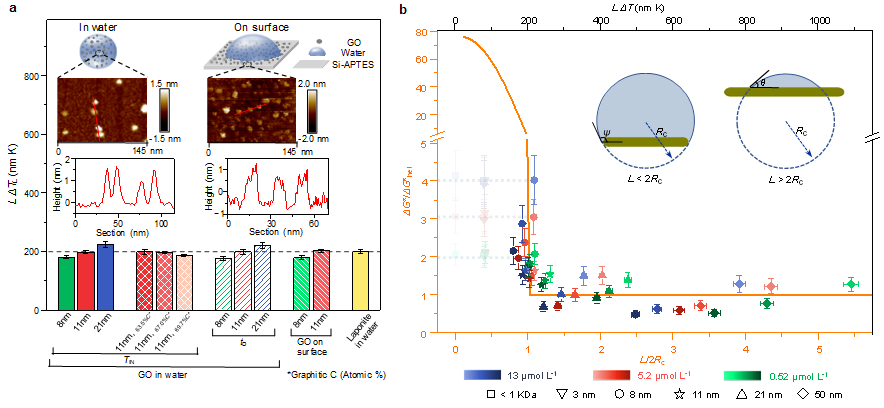 图1. a, 不同纳米片冰成核能力的突变; b, 氧化石墨烯表面冰成核自由能垒的突变,插图展示了纳米片尺寸小于或大于临界冰核直径时临界冰核形状的示意图。当纳米片尺寸小于临界冰核时,冰核生长受限于纳米片边缘,导致冰核形状改变,从而使成核自由能垒急剧增大。