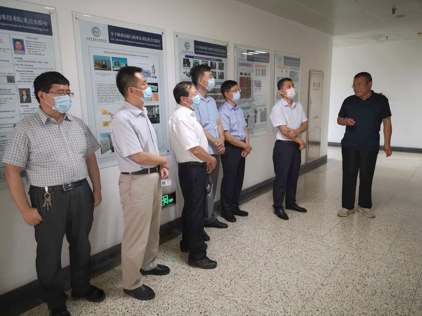 杨剑飞一行首先参观了分子纳米结构与纳米技术院重点实验室,实验室副主任王春儒就实验室的发展情况、研究领域及近年来取得的科研成绩作了详细介绍。