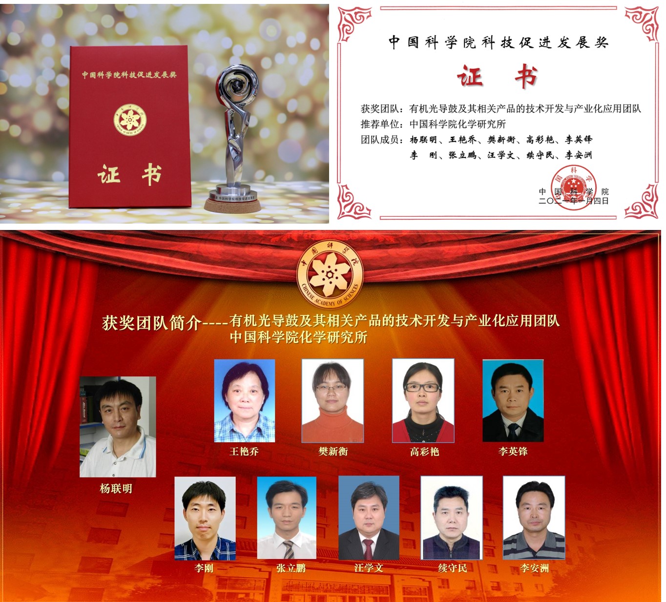 2021年1月15日,中国科学院2021年度工作会议在京召开。会上表彰了获得2020年度科技促进发展奖的获奖团队,化学所“有机光导鼓及其相关产品的技术开发与产业化应用”团队荣获2020年度科技促进发展奖。