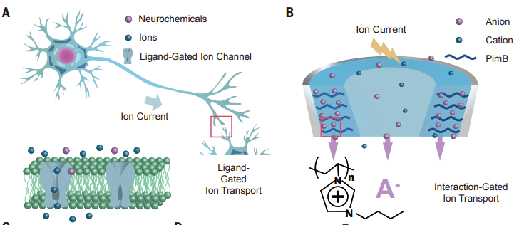 图. 神经元(A)和纳流体忆阻器(B)示意图