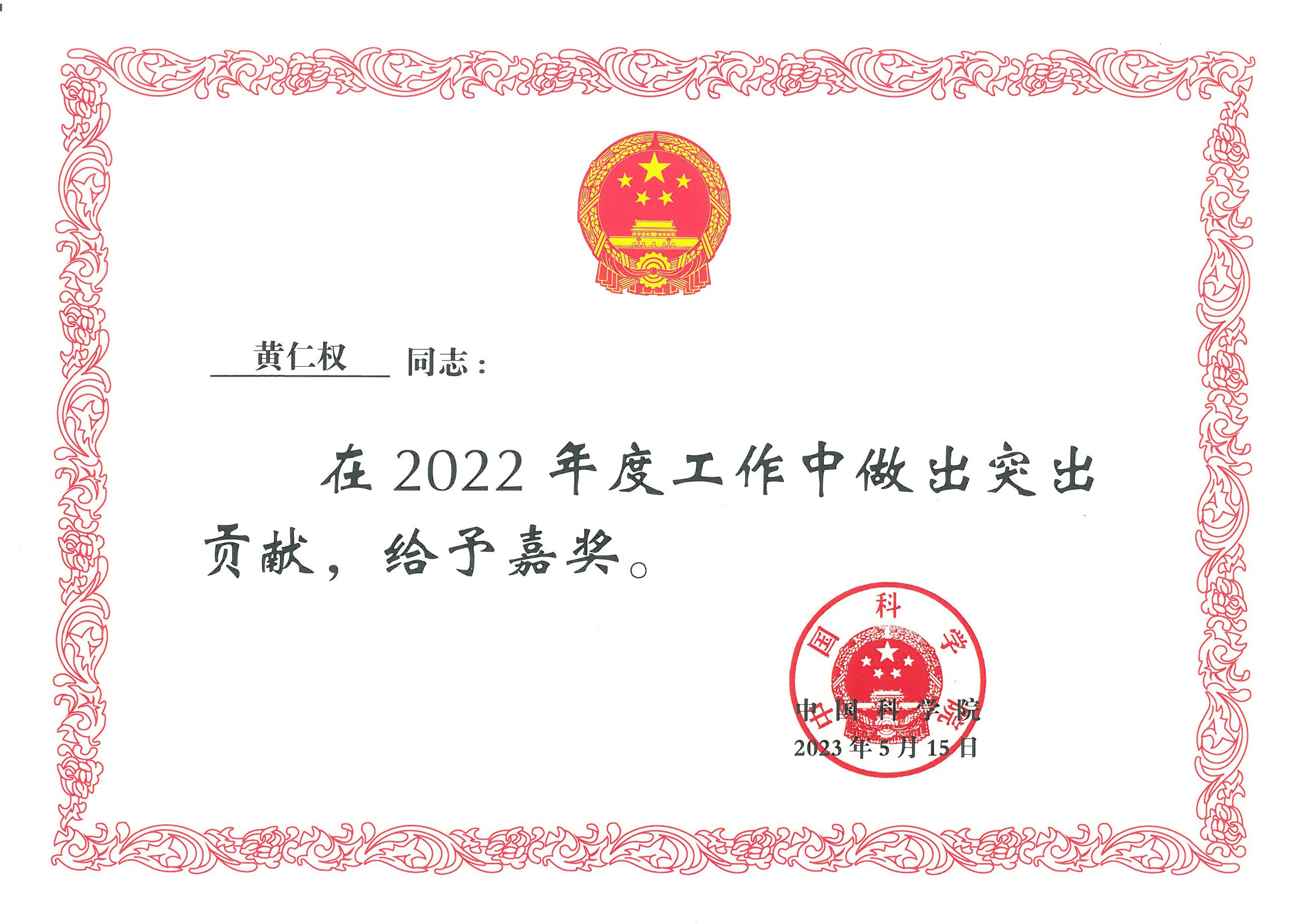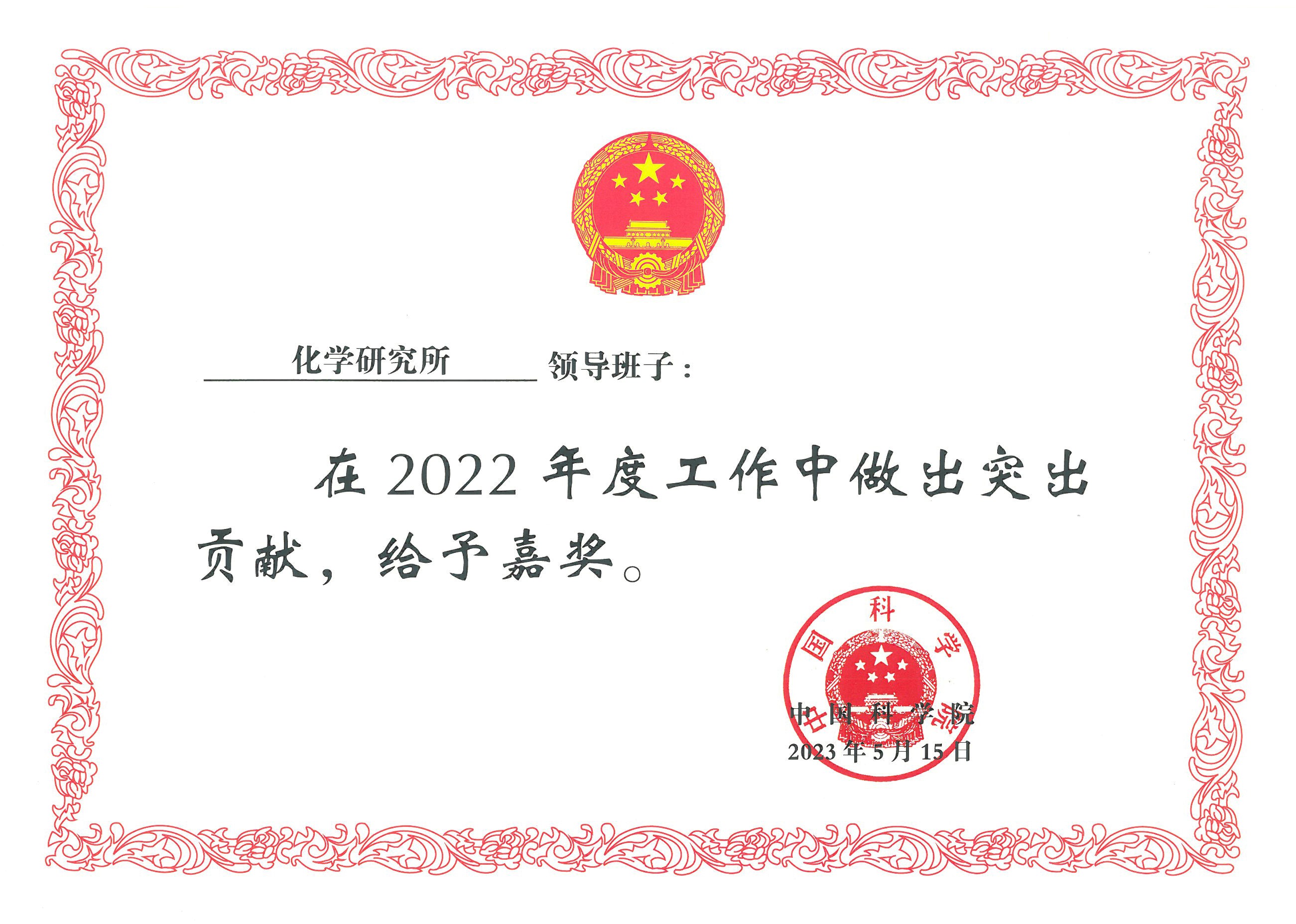 化学所荣获院属单位领导班子2022年度嘉奖;张德清所长和黄仁权副所长荣获院属单位领导人员2022年度嘉奖。