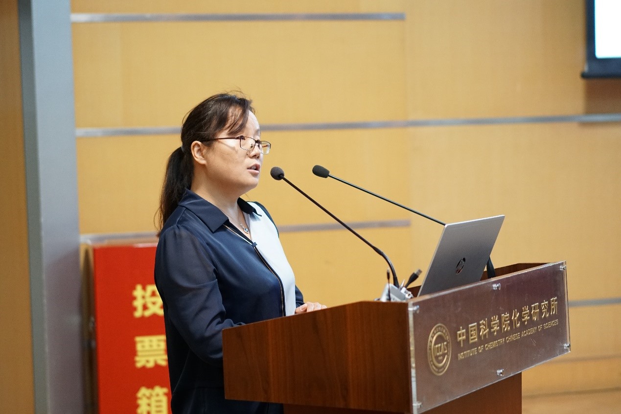 张德清所长代表所领导班子做述职报告。他从任期总体目标、战略规划与科技布局、承担科技任务与成果产出、队伍建设、科研平台与条件建设、科技合作与产业化、党建与创新文化建设、反腐倡廉工作、改革与管理创新等方面全面汇报了本届领导班子任期目标完成情况以及存在的问题,对下一届领导班子的工作提出建议,向院党组和人事局对化学所的指导、支持和帮助表示感谢,向化学所全所师生员工的辛勤付出以及对本届领导班子工作的大力支持表示感谢。