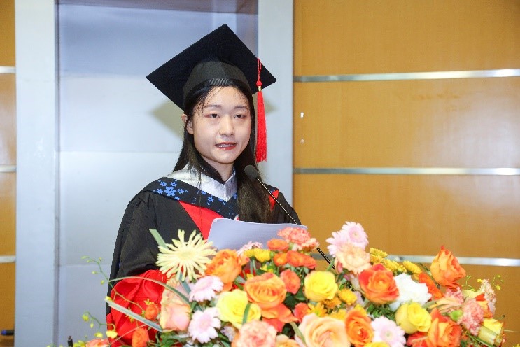 绿色印刷实验室张虞同学作为毕业生代表发言,她分享了自己在化学所学习生活的难忘经历,代表全体毕业生表达了对化学所、导师们和同学们的感激、依恋与不舍。她立志做拥有智慧并富有激情的人、做胸怀大志并脚踏实地的人、做有责任心并敢于承担重任的人,带着化学所的烙印,将所知所学贡献于祖国需要的每一个角落,不畏艰险,追求卓越。