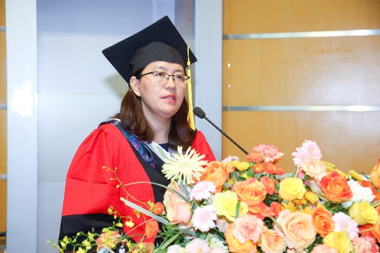 随后,有机固体实验室董焕丽研究员作为导师代表致辞。她首先祝贺毕业生们顺利毕业,之后她回顾了自己的求学过程以及课题组的发展,与毕业生分享以下心得和感悟:第一,常怀感恩之心,常为感恩之行;第二,干一行爱一行,任何事情只要用心去做一定可以做好;第三,正确看待事情的两面性,不要怕吃苦,在点滴工作中成长自己。