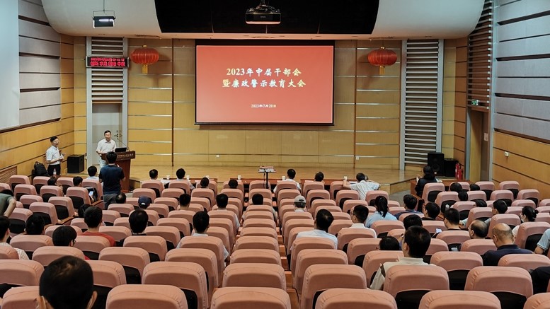 2023年7月20日上午,化学所组织召开中层干部会暨廉政警示教育会议。所领导、院士、党委委员、纪委委员、学委会正副主任、职代会常委、实验室负责人、课题组长、党支部正副书记、支部纪检委员、管理和支撑部门负责人参加了会议,行政秘书列席会议。会议由张德清所长主持。