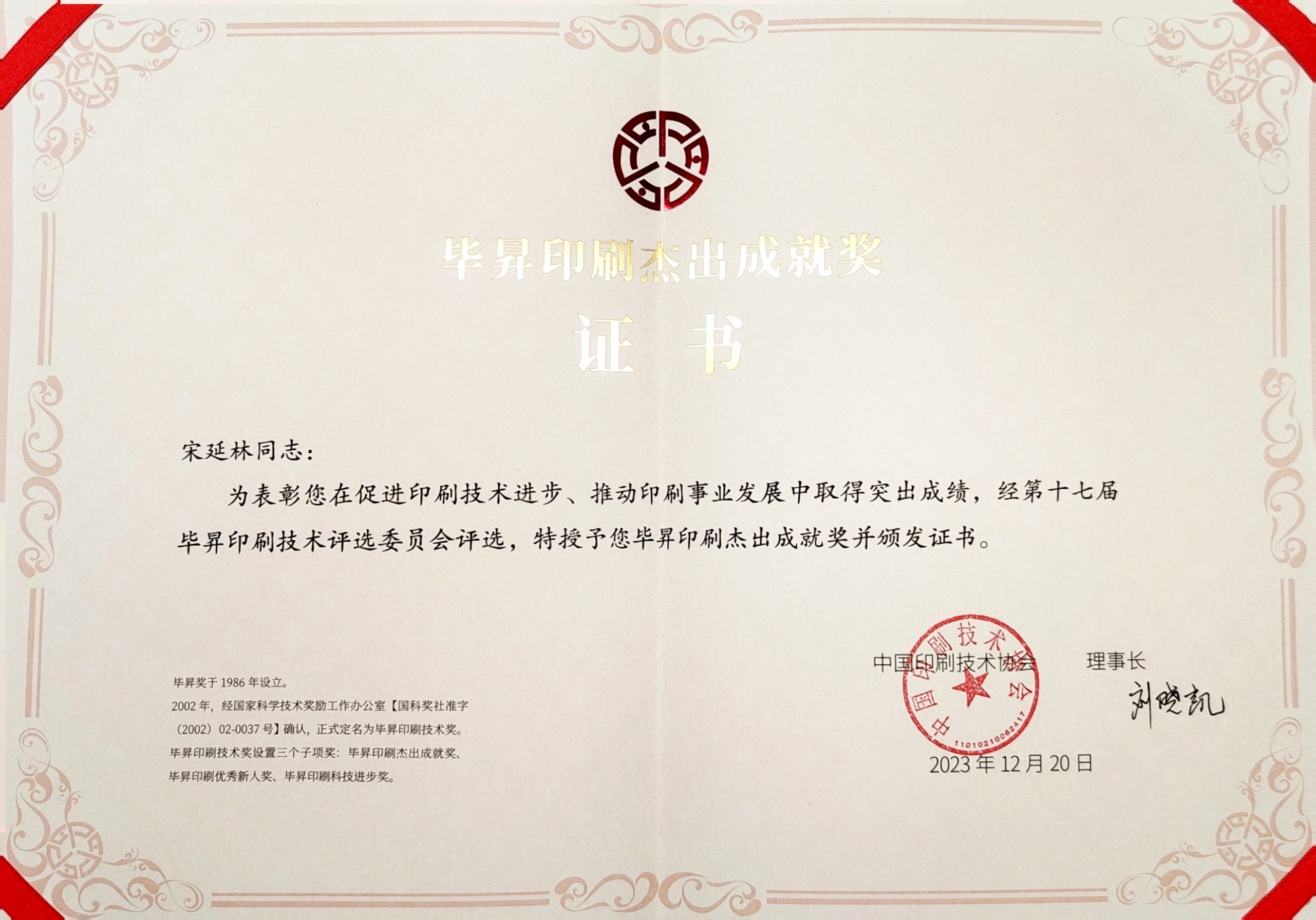 2023年12月20日,第十七届毕昇印刷技术奖颁奖大会在京举行。中宣部副部长张建春、中宣部印刷发行局局长刘晓凯等领导出席颁奖大会,并给8名毕昇印刷杰出成就奖及12名毕昇印刷优秀新人奖获奖者颁奖。