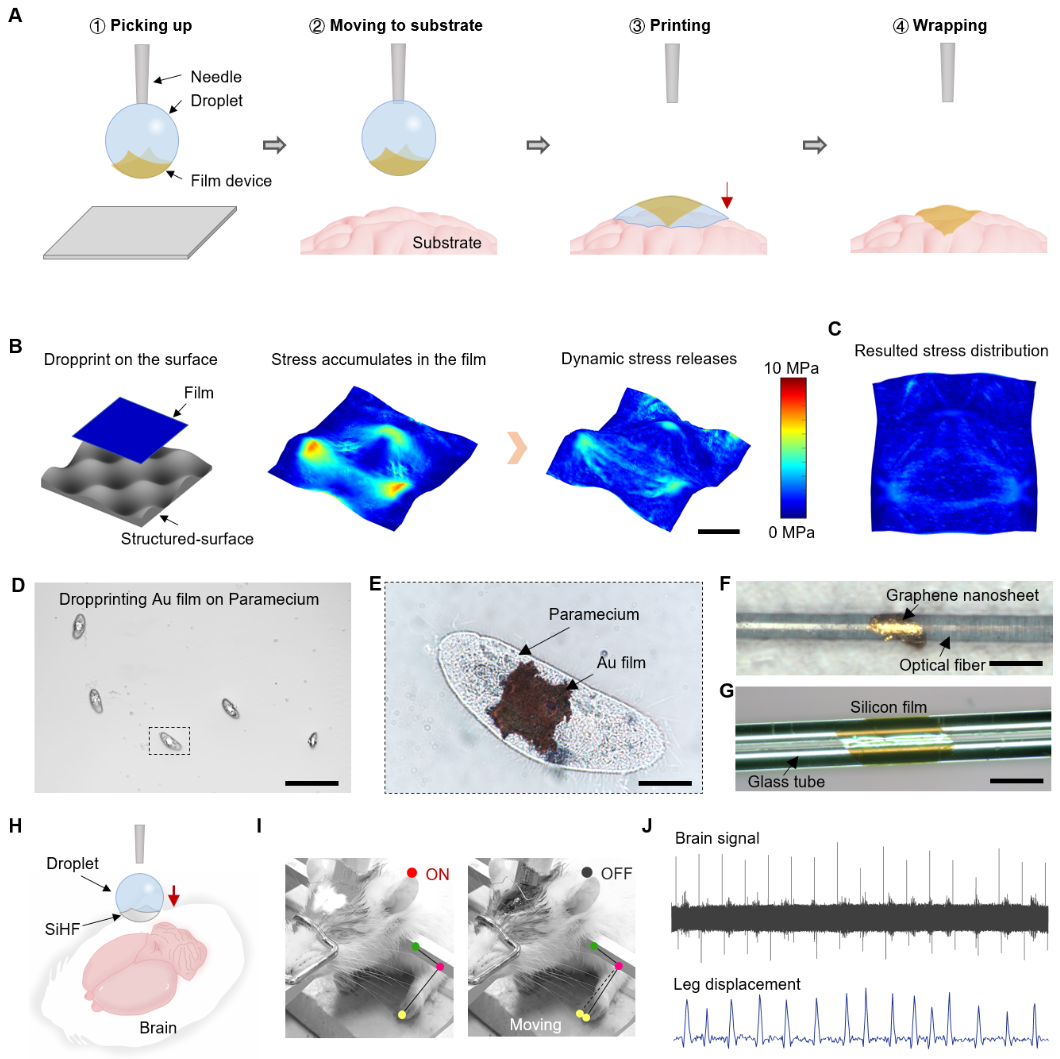 图1. 液滴打印实现薄膜的无应力保形贴附。(A)液滴打印的实施过程;(B)薄膜的动态应力释放过程;(C)薄膜中的应力分布;(D-E)在草履虫上打印的金薄膜;(F)打印在光纤上的石墨烯纳米片;(G)打印在玻璃管上的硅膜;(H-J)通过液滴打印在大鼠模型中构筑的“脑机接口”。