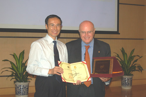 2007年9月14日下午,美国科学院院士、加州大学伯克利分校盖博·索马杰(Gabor A. Somorjai)教授应邀访问化学所,并做了题为“Frontiers of Surface Science”的分子科学论坛报告,万立骏所长为索马杰教授颁发了“分子科学论坛讲座教授”荣誉证书,并代表化学所授予盖博·索马杰教授亚博888名誉教授。