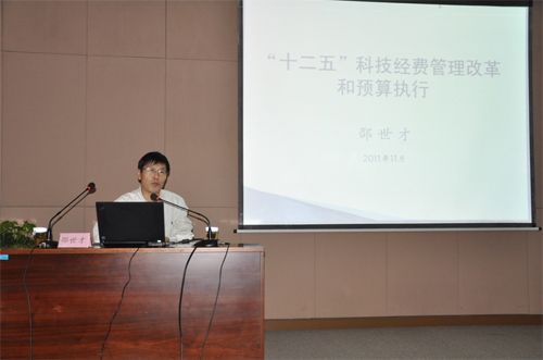 邵世才处长从“十二五”科技经费管理改革和科研经费预算执行两个方面进行了政策讲解。在科技经费管理改革方面,邵处长分析了“十一五”科技经费管理的情况、趋势和问题,介绍了“十二五”经费管理改革的总体思路,指出改革工作将以“继承衔接,优化创新,突出重点,以人为本”为原则,在创新制度建立、简化预算流程、强化单位责任、加强监督管理等方面进行重点改革。在预算执行方面,邵处长介绍了科技经费的监管重点及要求,强调科研人员要加强对经费管理的重视,并表示国家经费主管部门将在加强政策宣传、提高监管服务能力的同时,加大对违法违规行为的处罚力度。