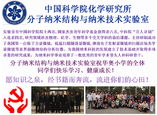 2011年12月19日,分子纳米结构与纳米技术党支部书记方晓红、副书记杨德亮组织支部党员代表赴石景山区华奥学校进行慰问,同时将纳米科技实验室捐赠的书籍送到了华奥学校校长的手里。