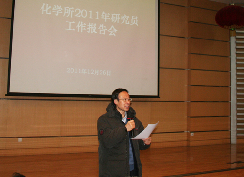 2011年12月26 -27日,化学所举行2011年研究员工作报告会和所级青年考核报告会。此次报告会邀请了中科院有关部门领导以及所务会成员、学术委员会成员、各实验室负责人担任专家评委,共有32位研究员和课题组长以及各实验室推荐的45位青年科技工作者在会上作报告。