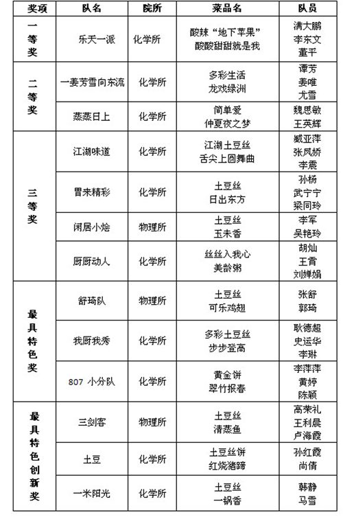 比赛评审团由来自化学所、物理所、计算所的研究生办公室和工会的老师、食堂专业厨师及研究生代表等10位评委组成,秉着公平公正的精神为这些选手的作品打分,经过一个上午的激烈角逐,共评选出十三支获奖队伍。