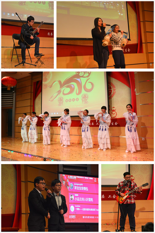 在幽默诙谐的配音视频《尔康看春晚》的引入下,劲爆的开场舞《因为红》正式引燃晚会的热闹气氛,活力四射的表演,赢得阵阵的掌声和喝彩声;《拜年视频》生动而全面地表达了化学所所领导、各实验室、各团支部的新春祝福和对化学所未来发展的美好愿景;离退休干部精心演绎的舞蹈《舞动中国》绚丽优美,演绎出老同志对祖国的热爱和对幸福生活的追求;二胡独奏《二泉映月》曲调优美流畅,旋律扣人心弦,让人不禁感叹其细腻深刻而又潇洒磅礴的演奏;歌曲表演《等待》声音圆润,气息稳定,一次次漂亮的升调与高音赢得了台下阵阵掌声;小品《我们爱化学》从今年的热点事件取材,设计出了一场搞笑逗乐,而又让人有思有感的“化学知识竞赛”,掀起了晚会的高潮;博士合唱团无伴奏合唱《美丽的草原我的家》、《八骏赞》,不加任何乐器的烘托和渲染,用同学们训练有素的歌唱技巧,展现了浓郁的民族特色,使人仿佛置身广阔辽远的大草原。
