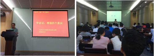 党支部书记王金本同志首先做了《学讲话增强四个意识》的报告,动员大家努力学习习近平总书记系列重要讲话,深入理解其科学内涵、基本观点和精神实质。针对习总书记“绿水青山就是金山银山”的论述,王金本书记回顾了本支部在2014年开展的“青山绿水之梦”主题活动的成果,鼓励大家再接再厉,将绿水青山的理念不断贯彻到生活的实践当中,践行绿色发展的理念。
